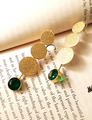 Exuding opulence and charm, these dangle earrings showcase a meticulously carved gold coin adorned with a captivating green semi-precious stone.
